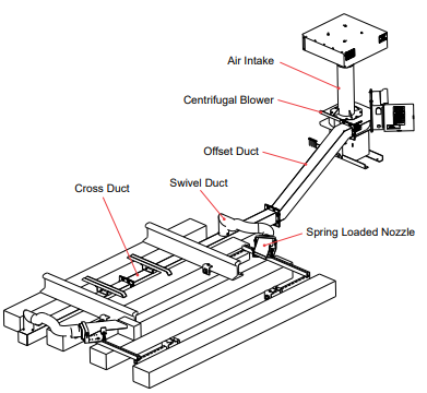 Không khí từ quạt thổi được dẫn bên dưới đường ray, thoát ra khỏi các đầu phun gắn trên đường ray với vận tốc xấp xỉ 100 dặm / giờ và được dẫn qua đầu dò hộp nóng.