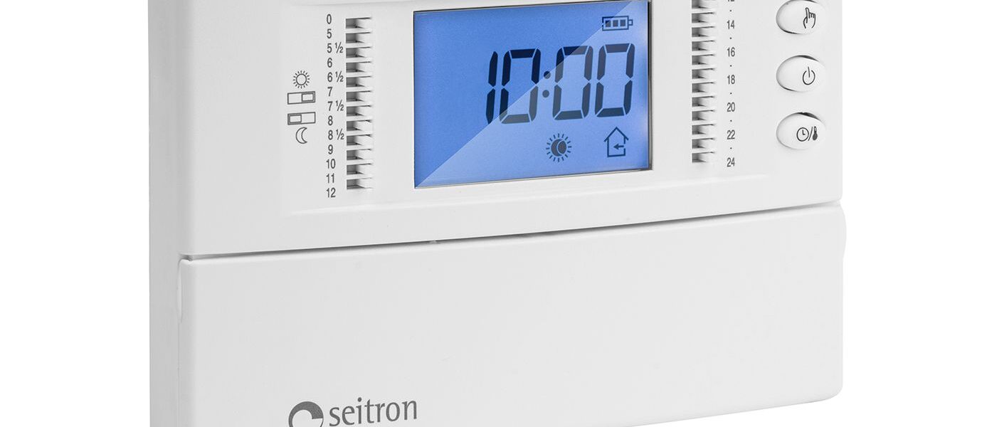Battery powered digital programmable thermostat Freetime Plus for heating/cooling, daily programming with pins 2 adjustable temperature levels and anti-frost function. Large backlit LCD display. Facility for remote sensor. Very easy to use.